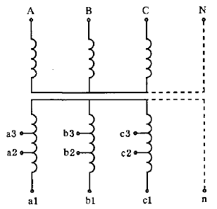 A、B、C、N為一次繞組端子;a1、a2、a3、b1、b2、b3、c1、c2、c3、n為二次繞組端子。