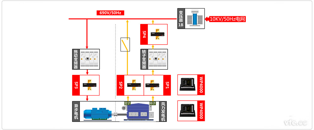 本雙饋風(fēng)力發(fā)電機(jī)試驗(yàn)臺(tái)測(cè)試系統(tǒng)采用WP4000變頻功率分析儀,SP1測(cè)量轉(zhuǎn)子發(fā)出的電能,SP2測(cè)量定子發(fā)出的電能,SP4測(cè)量轉(zhuǎn)子變頻器回饋至電網(wǎng)的電能,拖動(dòng)機(jī)的輸入測(cè)量由SP3測(cè)量。發(fā)電機(jī)定子發(fā)出的電能直接回饋至電網(wǎng),轉(zhuǎn)子發(fā)出的電能經(jīng)過(guò)變頻器回饋至電網(wǎng),實(shí)現(xiàn)電能的再利用,節(jié)約用電成本。